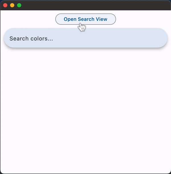 To open the search view when the search bar is tapped, call the open_view() method in the on_tap event handler.