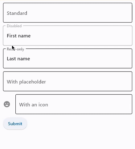 When the input field is empty and unfocused, the label is displayed on top of the input field (i.e., at the same location on the screen where text may be entered in the input field). When the input field receives focus (or if the field is non-empty) the label moves above, either vertically adjacent to, or to the center of the input field.